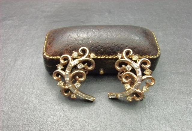 TOP ブランドTrifari(トリファリ) アイテムイヤリング 商品一覧 なだらかな曲線を描く台座にラインストーンが飾られたイヤリング。 ゴールドトーンとラインストーンの落ち着いた輝きがきれいな品。大きさ 縦: 3cm 横: 2cm クリップタイプ 50年代 Trifari(トリファリ) ラインストーンのイヤリング 価格: ¥6,400 (税込) 販売期間: 数量: 個 在庫: 1個 在庫 1個 返品についての詳細はこちら 画像の箱は撮影用小物で商品には含まれません。