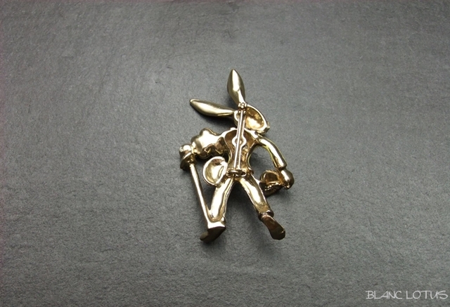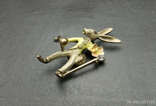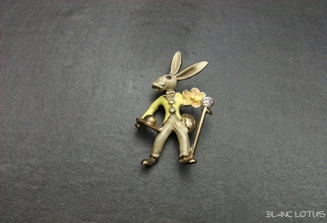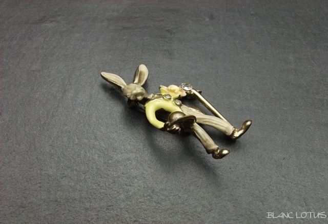 帽子にステッキ、花束を持ったエナメルのうさぎブローチ。 口元のひげや赤い目がキュートです。 上着のボタンやステッキの頭にはラインストーンが飾られたお洒落なうさぎです。