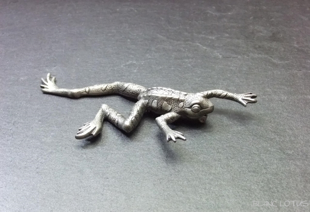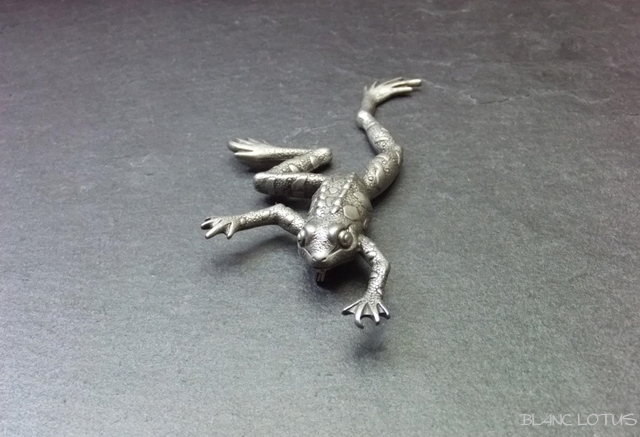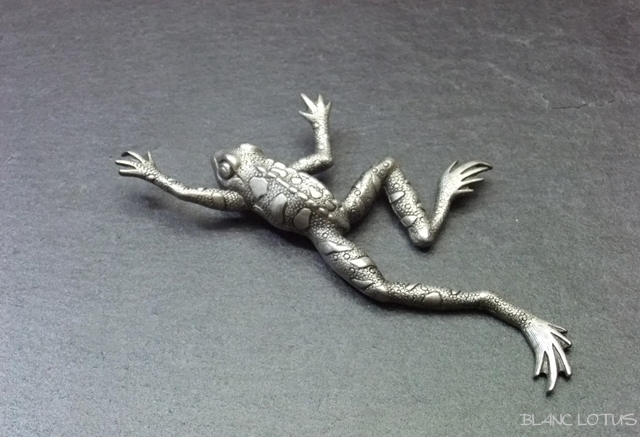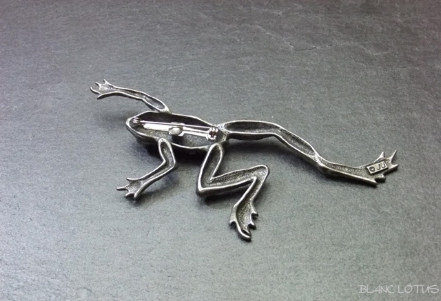 JJのカエルのブローチ。 カエルが伸びあがった躍動感のある品です。両手足を伸ばしたカエルのユニークな形をお楽しみください。JJはユニークな形状の楽しいブローチでコレクターもいるブランドです。