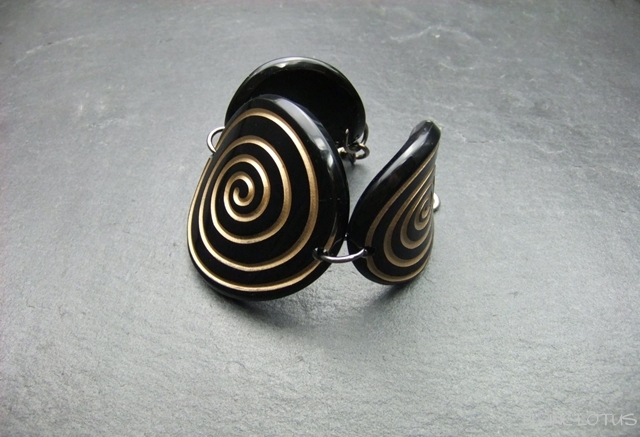 TOP アイテムブレスレット 商品一覧 ブラック地に金の渦巻きの大胆な意匠のブレスレット。大ぶりで存在感のある品です。長さ 18cm中心のパーツの直径 5.7cm サイドの二つのパーツの直径 各4.5cm ベークライトの渦巻きブレスレット 価格: ¥0 (税込) 販売期間: 数量: 個 在庫: SOLD OUT 在庫 SOLD OUT 返品についての詳細はこちら