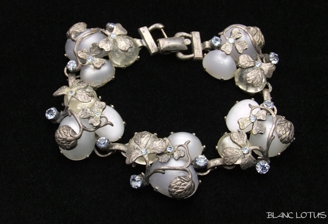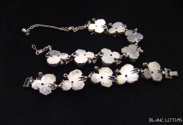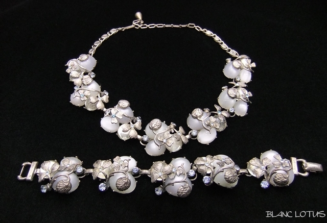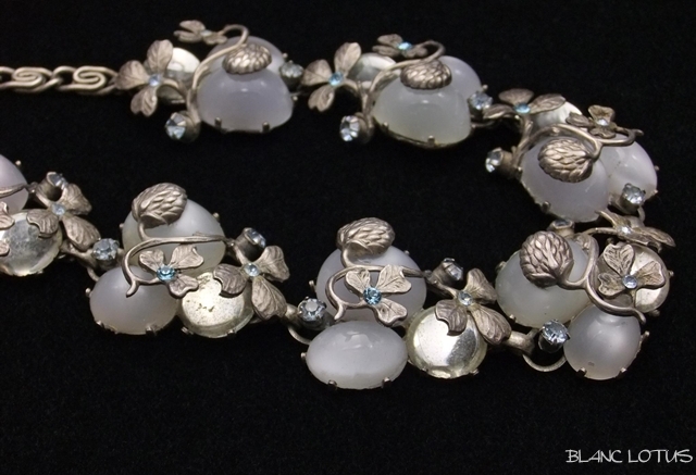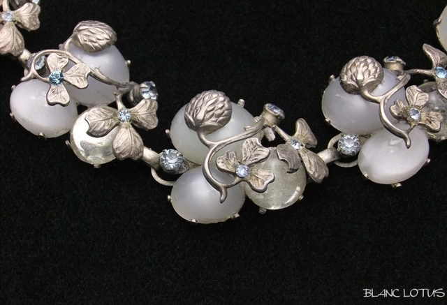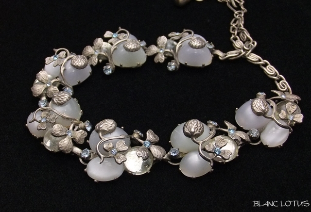 ムーンストーンを思わせるような乳白色な石一つと透明な石一つを一塊にしたものに銀色の葉と花が絡んだものが7個連なったネックレスは繊細で優美です。所々についた淡い水色と透明のラインストーンがアクセントになっています。ネックレスとブレスレットのセット