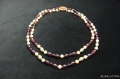 CELEBRITY(セレブリティ)の2連ビーズネックレス 紫のビーズをシルバーゴールドとパールのビーズで繋いだ2連ネックレス。個々のビーズをごく小さなクリアカラーのビーズを間に挟んで留めてあります。クリアカラーのラインストーンで囲まれた茶の縞が入った赤い留め金がチャーミングです。パールは真っ白ではなく少しベージュがかった落ち着いた色です。 長さ 約51cm