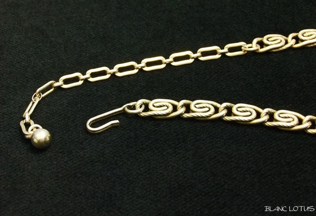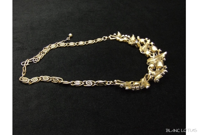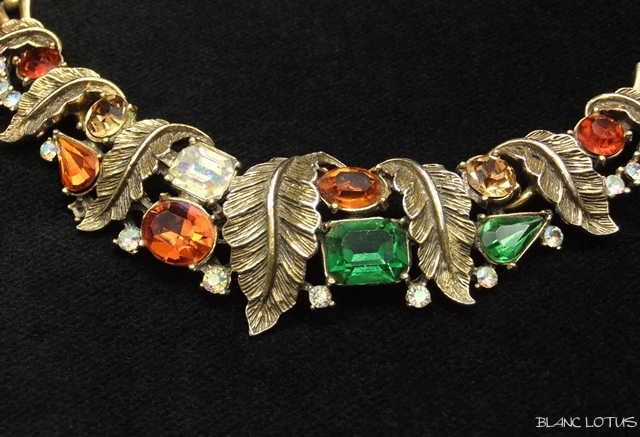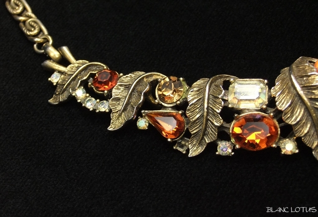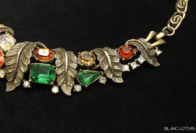 古金カラーのリーフの間にグリーンと濃いオレンジ、淡いオレンジ、クリアと4色のラインストーンが施され、まるで葉の中に木の実がなっているようです。リーフも細かに彫り込まれており質感を感じさせます。チェーンは模様入りと飾り無しのメタルを交互に絡ませてあります。