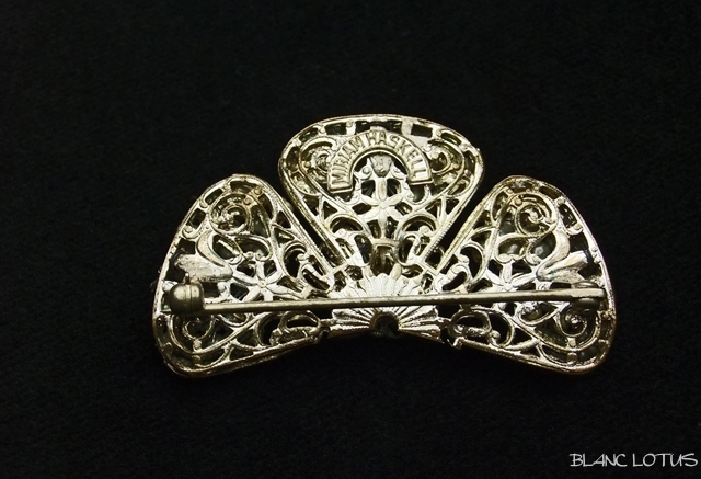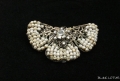 Miriam Haskell(ミリアム・ハスケル)のパールブローチ。蝶の形をした銀色の台に小さなパールが留められています。センター部分にはクリアカラーのラインストーンがつけられ輝きをはなっています。とてもクラシックなデザインの品です。経年により金属部分に変色が見られます。