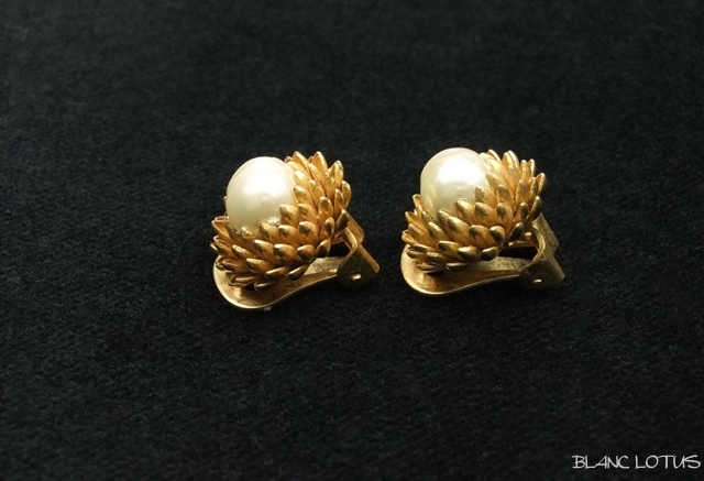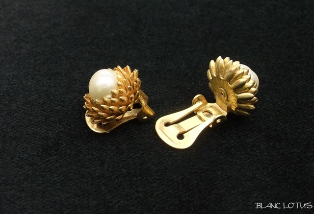 Miriam Haskell(ミリアム・ハスケル)のバロックパールのイヤリング ころんとしたパールが花びらの中に埋まった小さめの品です。大きさはちょうど親指の爪くらい、落ち着いたゴールドの輝きにパールの白さが映えます。