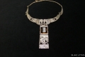 琥珀色の石がついたアールデコネックレス 古金色のチェーンに琥珀色のセンターストーンが下がっています。チェーンはには馬とチューリップが透かし彫りになっています。落ち着いたデザインで、お仕事にも使えます。 長さ 約44cm センターストーンの大きさ 長さ 約2cm 幅 約1.5cm センターストーンを含めてチェーンから下がっている長さ 約 6cm
