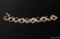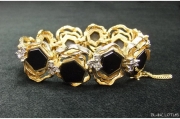 それぞれの黒のヘキサグラムが金の波打ったようなシェイプの模様で囲まれ、まるで花が連なっているように見えます。個々の花の横に小さなクリアカラーのラインストーンが3つセットされキラキラ輝いているのがかわいい感じです。ともすれば地味になりそうなブレスですがこの小さなラインストーンがあるのできれいめに仕上がっています。