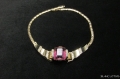 アメジストカラーの大きめラインストーンがついたネックレス。エメラルドカットのセンターストーンのサイドにクリアなラインストーンが施してあり落ち着いたスタイルになっています。