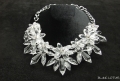 ラウンド型ラインストーンを中心に抱いたクリスタルの花のネックレス。 花の下にはドロップ型とプリズム型のストーンが下がり華やかさをアップしています。クリアなクリスタルは下の衣装により様々な表情を見せてくれると思います。
