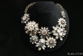 淡いオレンジがかったピンクとクリア、乳白色のラインストーンでつくられたフラワーネックレス。落ち着いた色合いなので使いやすくなっています。
