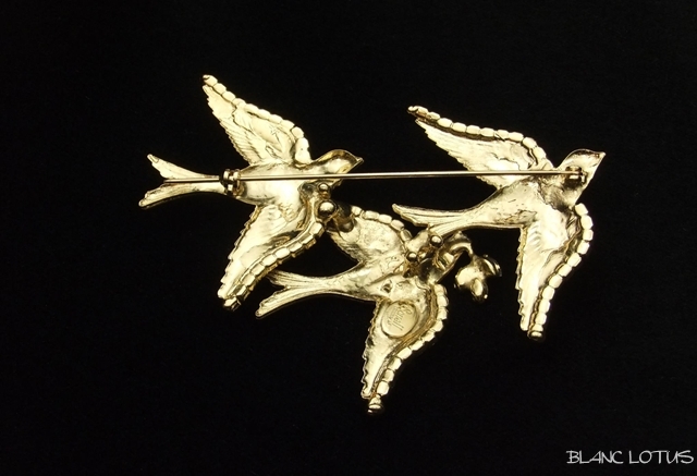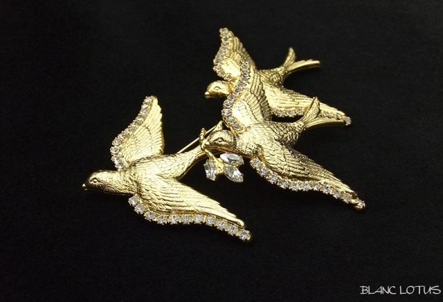 三羽の金の鳥が飛んでいるブローチ。一羽はクリスタルで作られたオリーブを咥えています。羽根が一枚一枚彫り込まれているので質感のある仕上がりになっています。翼の縁にラインストーンが飾られた華やかな品です。