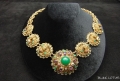 金線細工にオーバル型の天然石、ラインストーン、エナメルの花などを飾ったネックレス。ドーム状になるようにつけられた金線にストーンや小さな小片で作られたエナメルの花がセットされています。ダブルチェーンは束ねた金線を捻って作られています。職人の技が感じられる立体感のある品です。多色使いですが、落ち着いた印象です。